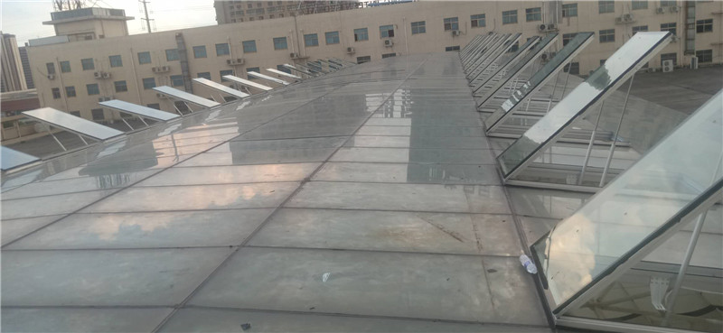 根據施工圖紙,需先將部分采光玻璃拆除,光滑的玻璃屋面給現場施工增加了難度。現場環境不允許大型作業車入場作業,鑫友售后安裝部員工硬是憑自身力氣將一塊塊玻璃拆除,更換上鑫友電動排煙窗。