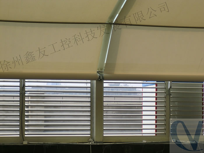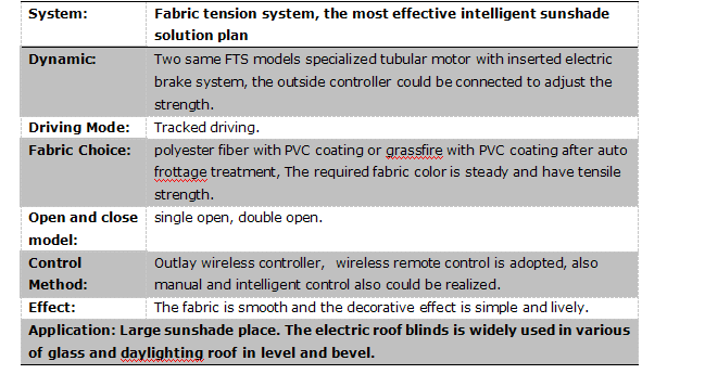 FTS天棚簾特別適用于普通電動卷簾無法安裝的彎曲、傾斜的場合,整個系統(tǒng)由驅動系統(tǒng)、面料和控制系統(tǒng)三部分組成,驅動系統(tǒng)采用2個FTS專用管狀電機,分別安裝在兩條卷管中,面料一端固定在其中一條卷管上,固定面料另一端的鋼絲繩卷曲在另一條卷管的卷繩器上。這兩臺電機通過一個專用的控制器協(xié)調工作,其中一臺電機提供面料運行的動力,另一臺電機的剎車同時工作,提供一定的阻力拖住面料,避免面料下墜,天棚完全打開后,面料會卷在其中一條卷管上,運行中或停止時面料均有張力,可制作大面積的平面或弧形面的天棚簾系統(tǒng)。